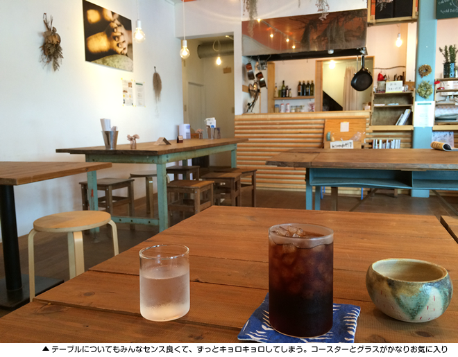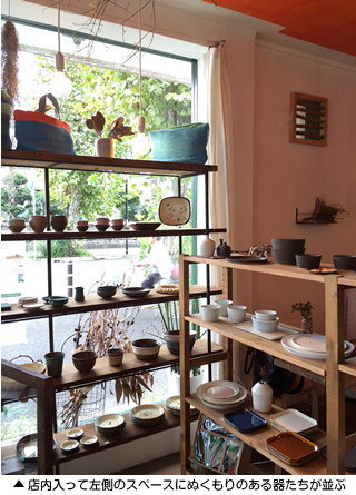 手前にいろいろな雑貨や器などの展示販売スペースがあり、レジを通って奥のテーブルに向かうようレイアウトされています。