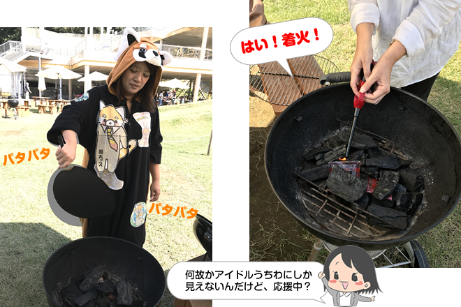 まずは、炭を熾さないと。今日は、チェリー隊長も、てらっちもいないので、二人でどうにかするしかありません。