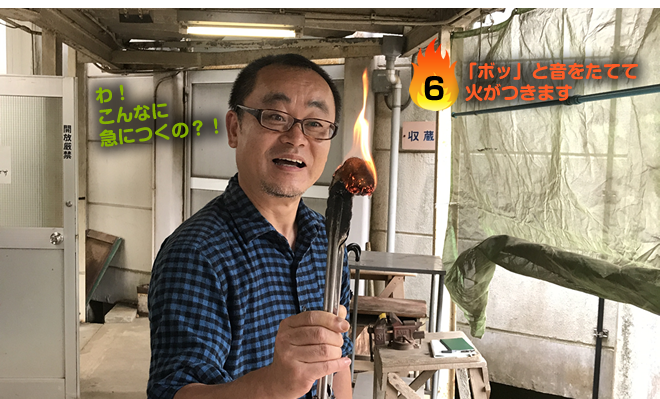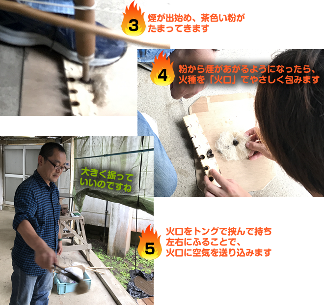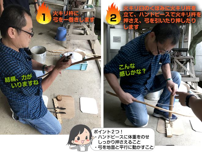 - 棒を両手でするやり方は「揉みギリ法」というのです。あと棒の下のほうに取り付けたはずみ車の回転力を使う「まいギリ法」という方法も見たことがあるかと思うのですが、ここでは「弓ギリ法」で火をおこします。