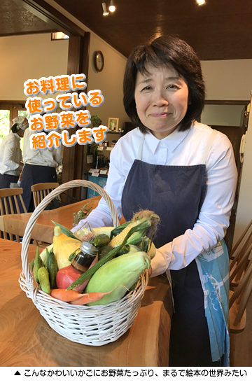 - いつもこのようにかごに野菜やブルーベリー酢など、使っている食材を入れて、テーブルごとに説明にあがるのです。