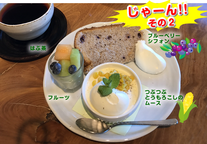 - 今日は、つぶつぶとうもろこしのムースとブルーベリーシフォンです。