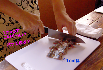 - 2枚使いましょう。表と裏で1匹分です。サンマは、アジに比べて身が柔らかいので、1cmくらいの幅に切ってください。