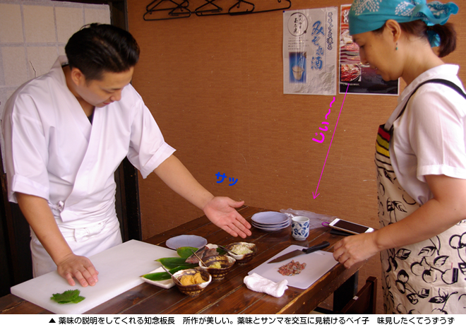 すると、板長の知念さんがいらっしゃり、お魚と薬味が運ばれてきました。