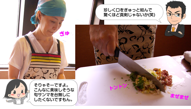 - では、ちょっと味見を。あ!美味しいなぁ。サンマのなめろうも美味しいね。