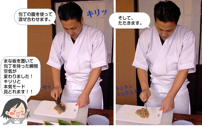 - さっきのサンマよりは、少し多くてもいいですね。薬味も入れて混ぜましょう。