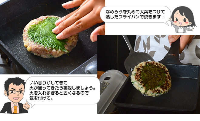 今日は、丸めて大葉をつけてフライパンで焼きましょう。 - はい。