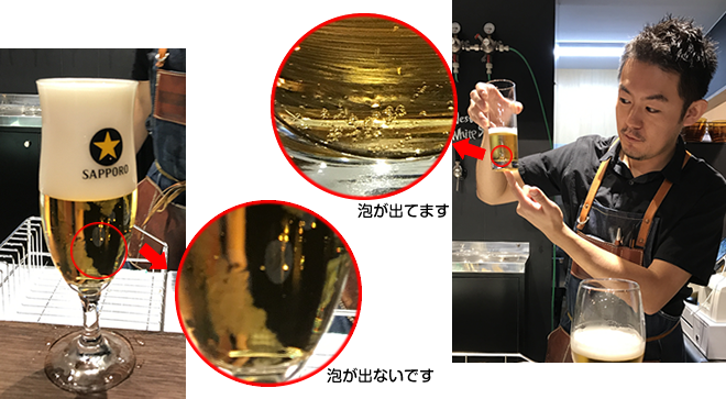 - グラスの洗浄がきちんとされていないと、汚れや油が残って、そこに気泡が付着します。そうするとそこから炭酸ガスがどんどん抜けていくのです。また、汚れの臭いが残ったり、油によって劇的に泡持ちが悪くなってしまいます。