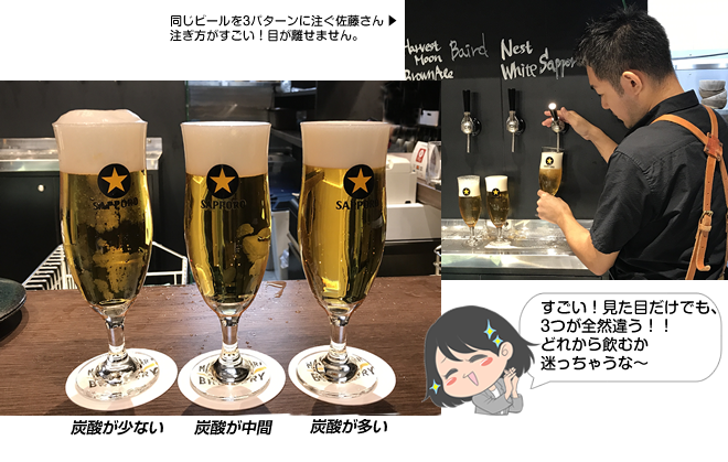 よくビールでお腹いっぱいになってしまうとかいいますが、炭酸でお腹いっぱいになっているので、適度に炭酸を抜くと何杯でも飲めちゃいますね。 - なるほど!ビールは好きですけど、炭酸が好きなわけじゃないので、この炭酸が少ないのがいいですね。佐藤さんの注ぐビールをずっと飲みたいなぁ〜