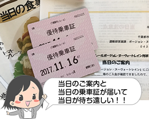 封筒の中には、当日のご案内と1日乗車券などが入っておりました。送っていただいた乗車券で当日は集合場所の【千葉みなと】駅まで行くことができます。