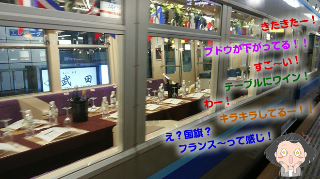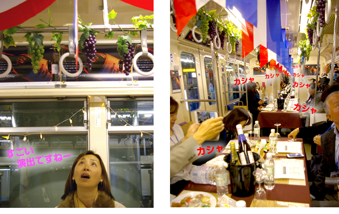 - まずは、ボージョレ・ヌーボー解禁にちなんだ、ワイン列車が企画されるから、乗りに行こうよ。一人5500円で、飲み放題お食事つきだよ。