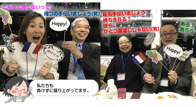 車内では、飲む、しゃべる、食べると、ワイワイ盛り上がり、そこに写真用小道具がモノちゃんトラベルより投入されました。
