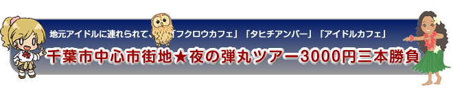 「ふくろうの城 千葉店」と「GOHAN&BAR TAHITI」は、私一人でも行くことはできると思いますが、「あいどるかふぇ 2ねん8くみ 千葉校」は、女子はなかなか一人では行けないかな。でもこのプランに参加して、あいみ姫とりっちゃんと楽しくお話しながら、お店を巡って、最後に彼女たちのライブを見れて、とても楽しかったです。千葉の夜っていろいろなお店があるんですねぇ。