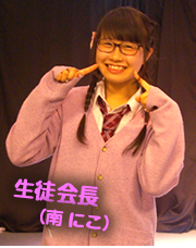 ステージに、生徒会長の「南 にこ」ちゃんが登場し、ご挨拶と今日の説明がありました。にっぱち(2ねん8くみ)のステージを見て、その後「千葉あそび」特別メニューの給食をいただけるそうです。