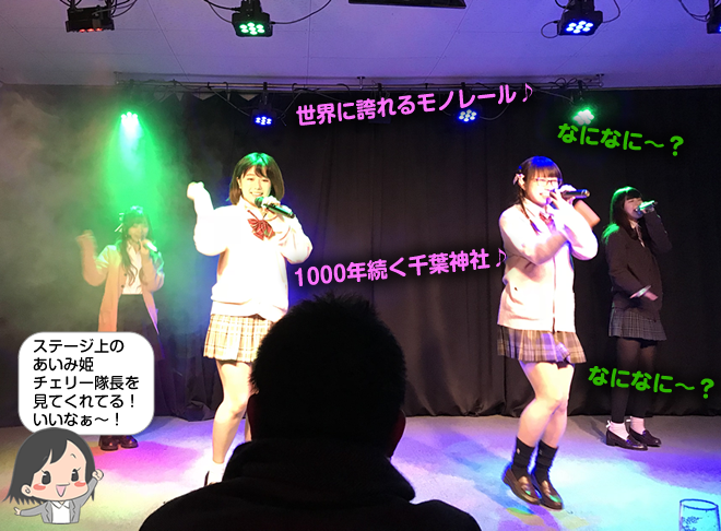 1列目と2列目の真ん中の席が空いていたので、チェリー隊長が1列目、ベイ子が2列目に座りました。周りを見渡すと、他のアイドルも何名かいました。