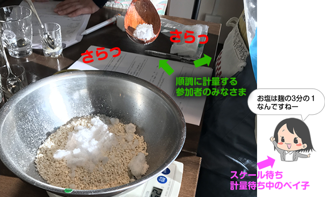 麹はすんなりと量れたのですが、塩を入れ始めた瞬間、
