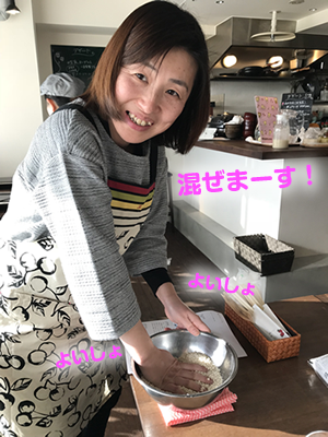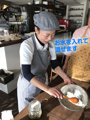 - 手で握って麹が団子になるくらいにもみ込めたら、お水を量って入れて、かきまぜましょう。