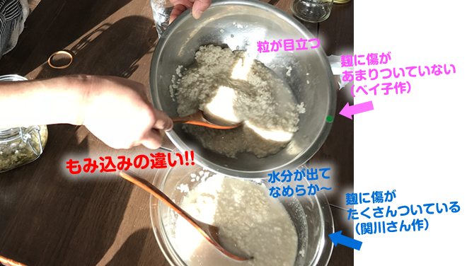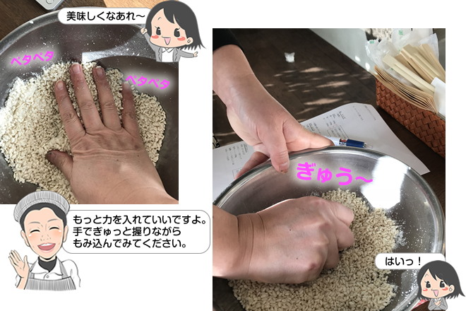 麹に塩で傷をつけたいので、体重かけて力強く押すような感じで。 - かなり力を入れていいのですねぇ。