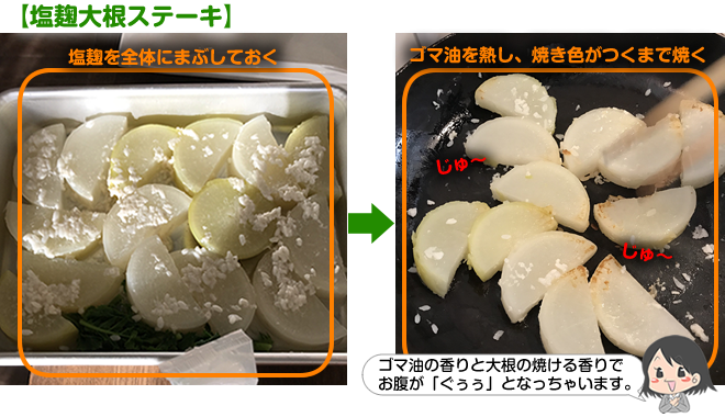 皆さまに配膳と、あと「塩麹大根ステーキ」のお大根だけ焼いていただきたいのですが。