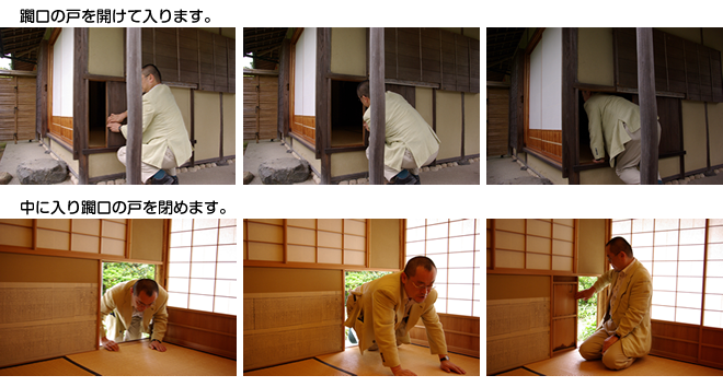 4)踏石(沓脱石)の上にしゃがみ、躙口の引き戸を引き、席中をうかがったあと、躙りこんで席入りする。