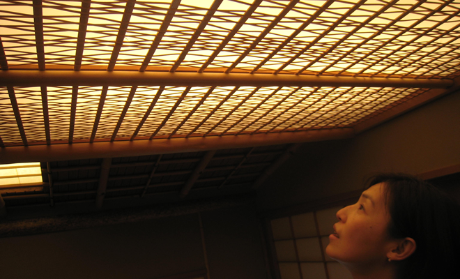 躙口に頭を入れると初めに見えるのが床の間なのです。なので床の間には掛け軸をかけ、季節の草花を飾り、お客様をお迎えするのです。 - 天井がすごいです。竹を組んでいるのですね。