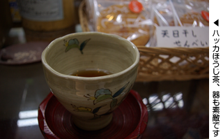 - お疲れさま。これよかったら召し上がって、今年の逸品「フレーバーティハッカほうじ茶」です。
