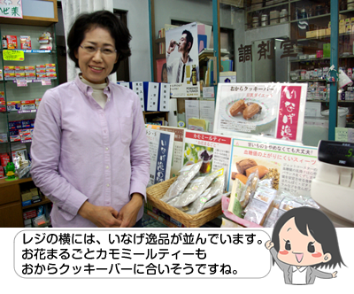 お店に入るとたくさんのお薬や漢方薬が並んでいました。ダイエット食品やカモミールティーも並んでいます。