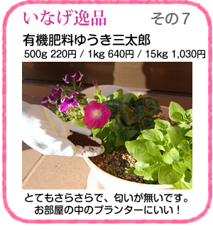 - こちら「有機肥料ゆうき三太郎」なんですけど、あ、写真撮りますよね。ここに出しましょうか。