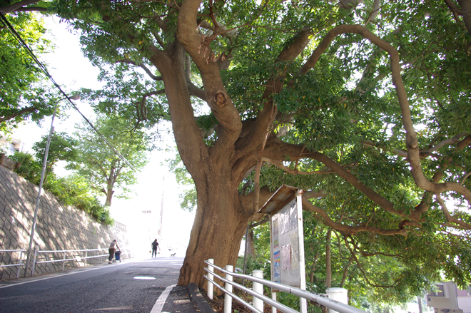 鋭角に分かれた交差点に向かって歩いていくと、「あ、ありました!すごく大きな木。それも道に生えてる!」