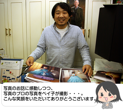 - 昔は背景の上で写してましたが、今はリアルなスタジオで撮影することが多いです。(七五三の女の子の写真を拡げていただきながら)こんな感じです。