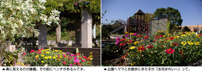 坂の大きな木からもっと坂を下り、少しあるくと「稲毛東公園」が見えてきます。 お話を伺った通り、公園の中に藤棚と花壇があり、花壇には色とりどりのお花が咲いていました。芝生の方ではゲートボールをしてる方々も。花壇の周りにはベンチもあるので、ここで一息入れるのもいいですね。