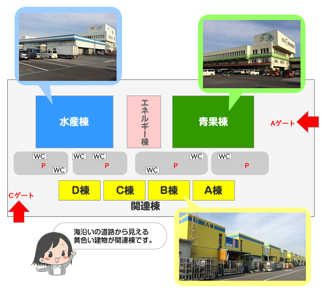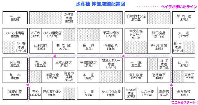 それに、そっちは「青果棟」方向だ。 - あ、そうでした。「水産棟」へ行きたいです。水産棟!