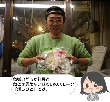 魚が真空パックされ「燻しびと」と書いてある商品が並んでいました。