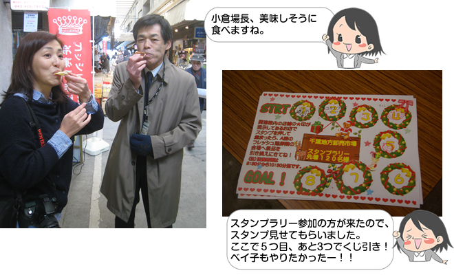 隊長がお買い上げだそうなので、ベイ子がさっきの鮭の詰め放題のお礼にプレゼント。すると、通りすがりの男性も試食して「俺もひとつ」とお買い上げでした。