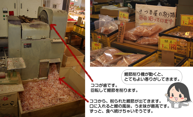 店頭には大きい袋に入った削り節が並んでいます。この削り節は毎日削っているそうです。
