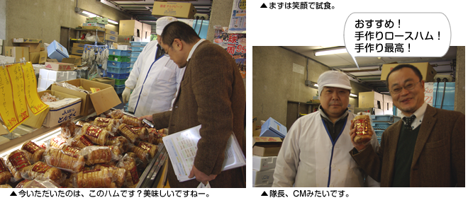 - ありがとうございます。(つまんで鼻に近付けて)香りが強いですね。(口にいれて)旨みが!美味しい!隊長も味見させてもらってください。