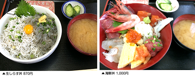 取材して長谷川食堂に着いたのは11時。さすがに10食限定は終わっていたので、「生しらす丼 870円」と「海鮮丼 1,000円」をいただきました。