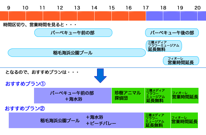 いなげの浜で1日遊ぶには、下記の表を参考に自由にチョイスして楽しんでください。