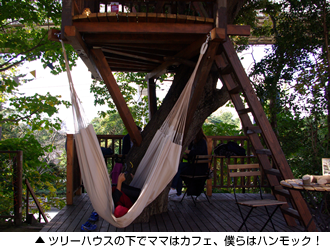 ツリーハウスの下にある椅子でママさんたちはおしゃべり、子どもたちはハンモックに揺られていて、とても気持ちよさそうで楽しそうです。こちらのハンモックにも乗ってみなくては!と思いながら眺めていると・・・。