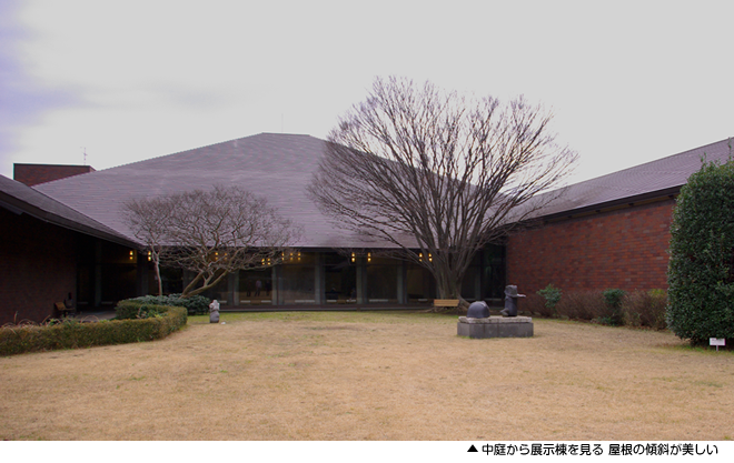 美術館入口からエントランスに入り左側の窓を除くと中庭が見えます。