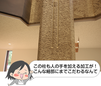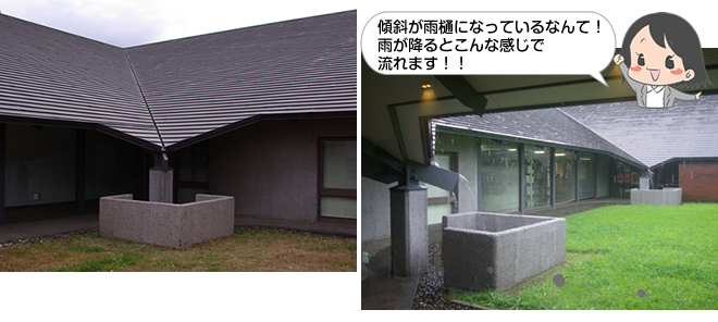傾斜した構造材をそのまま雨樋として利用するのも建築上珍しいですし、内装もコンクリート打ちっぱなしではなく人の手を加えて加工して無機質にならないよう造られています。
