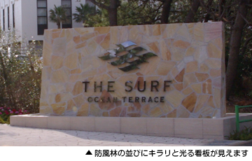 稲毛海岸のヨットハーバーから幕張方面へ進むと、歩道の脇の入口に明るい茶色系のモザイク石板が見えてきます。銀色の「THE SURF OCEAN TERRACE」のロゴが光っています。