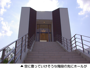 敷地の中央、門から真っ直ぐ進む道、ホールへと続く階段が素敵です。