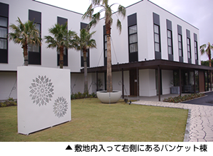 門を入り、正面にある建物が「ホール棟」、向かって右側の建物が「バンケット棟」、向かって左側の建物が「レストラン棟」になります。