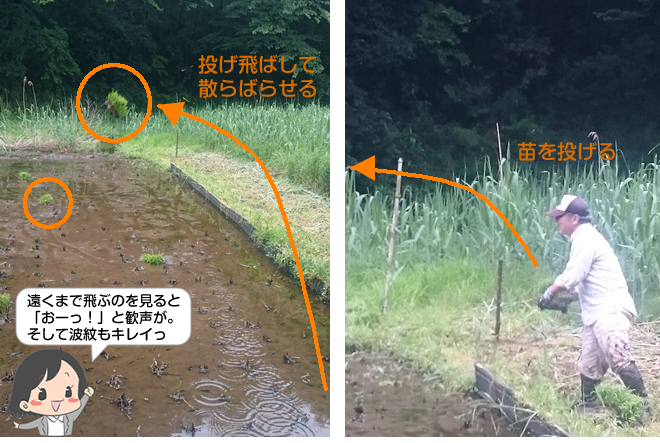 「畔と畔に検縄を張って、みんなで並んで植えます。植えたら後ろに進んでいきます。」と説明を聞いていると、苗を投げる人が!!