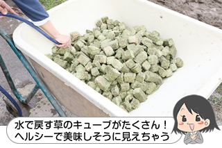 - 草です。草を乾燥してキューブ状に固めたフードがあり、それを水でふやかしてあげます。ふりかけみたいに麦や塩を混ぜる時もあります。