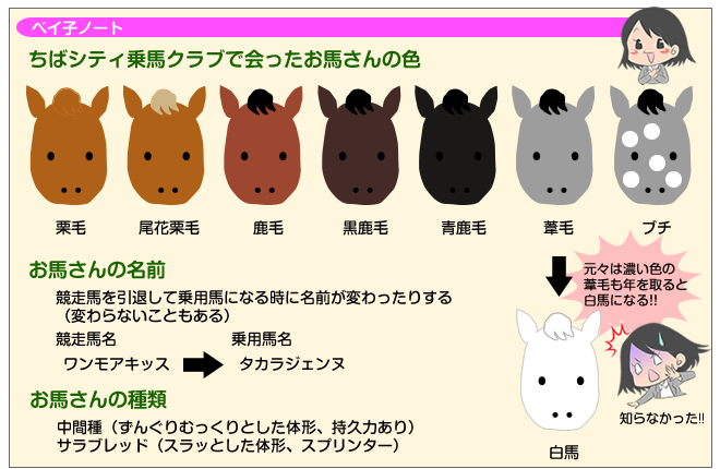 一頭ずつ紹介しきれないので詳しくは「ちばシティ乗馬クラブHPスタッフ・馬紹介」へ。
