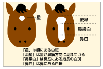 - それは(笑)関係ないですね。サラブレッドは血統書を登録するのですが、その時に細かくつむじの場所や白い箇所(顔だけじゃなく足なども)の位置も記されます。